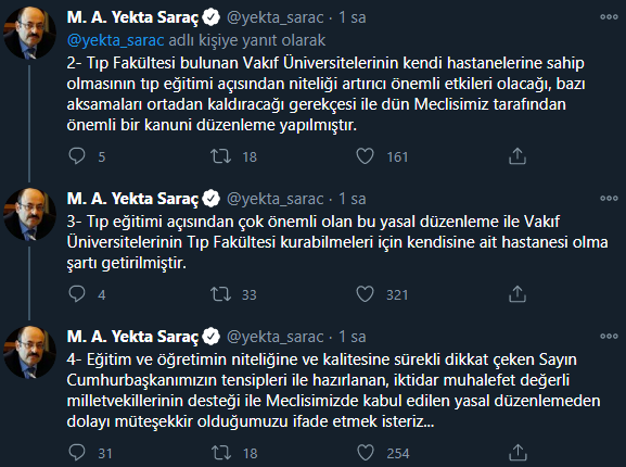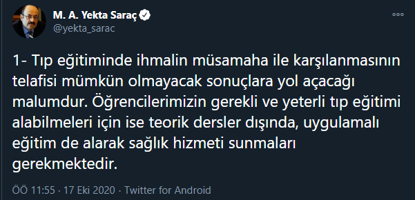 YÖK Başkanı Saraç'ın Twitter açıklamaları şu şekilde;
