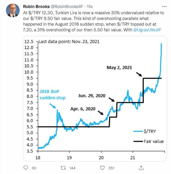 Yani Brooks yaptığı paylaşımda, aslında Türk Lirası'nın şu anki durumdan yüzde 30 daha değerli olduğunu aktardı. Grafikli paylaşımda değerlemenin Mayıs 2021'den itibaren hızlı bir şekilde yukarı çıktığını ifade etti. Bu durum ise TL üzerinde oluşturulan manipülasyonu gözler önüne seriyor.