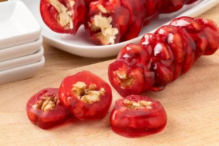 Türkiye'nin geleneksel tatlı kültürünü temsil eden ve Almanya’da gurbetçiler tarafından da ilgi gören “narlı cevizli sucuk”, doğal içerikleriyle öne çıkarken, bu kez içeriğindeki doğal ancak hayvansal kökenli boya maddesi nedeniyle gündemde.