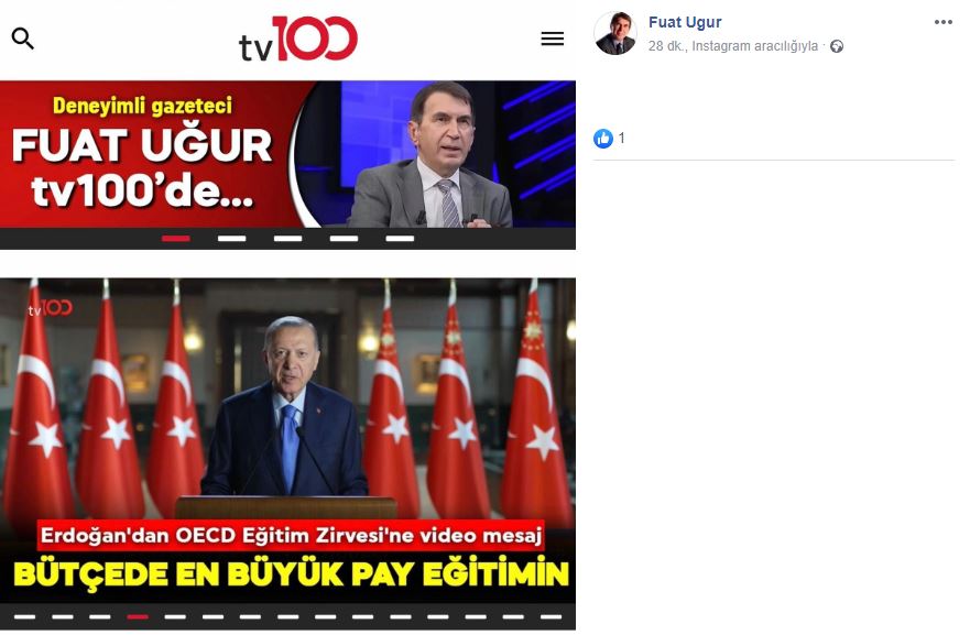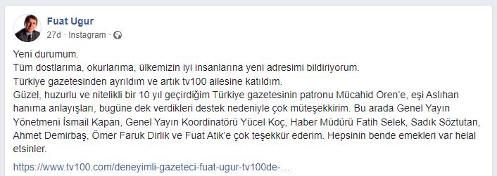 Fuat Uğur yaptığı açıklamada, “Yeni durumum. Tüm dostlarıma, okurlarıma, ülkemizin iyi insanlarına yeni adresimi bildiriyorum. Türkiye gazetesinden ayrıldım ve artık tv100 ailesine katıldım.” İfadelerini kullandı.