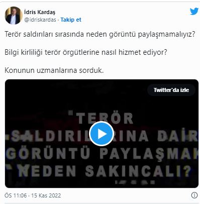 Dezenformasyonla Mücadele Merkezi Koordinatörü Kardaş, sosyal medya hesabından "Terör saldırıları sırasında neden görüntü paylaşmamalıyız? Bilgi kirliliği terör örgütlerine nasıl hizmet ediyor? Konunun uzmanlarına sorduk" başlığı ile paylaştığı videoyla uzmanların görüşlerine yer verdi.