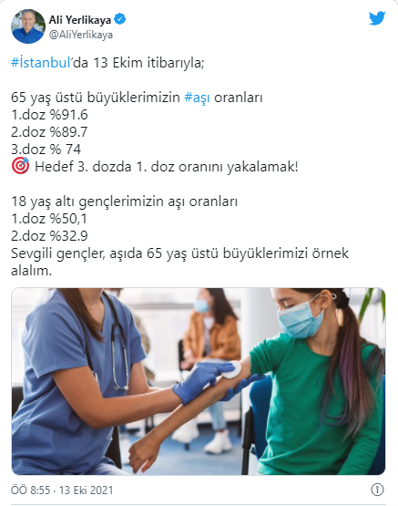 İstanbul Valisi Ali Yerlikaya, 65 yaş üstü ve 18 yaş altı vatandaşların aşılama oranlarını Twitter adresinden paylaştı.