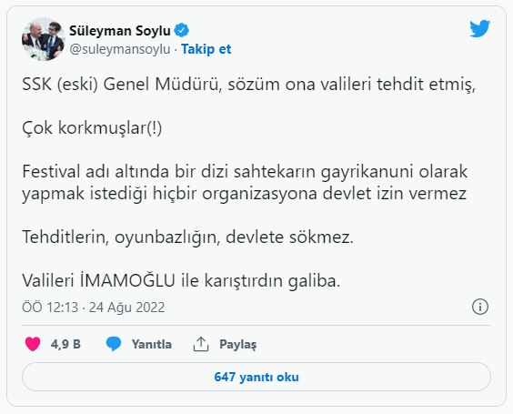 İçişleri Bakanı Süleyman Soylu, Kemal Kılıçdaroğlu'nun tehdit gibi sözlerine sosyal medya hesabından cevap verdi. Bakan Soylu paylaşımında, "SSK (eski) Genel Müdürü, sözüm ona valileri tehdit etmiş, Çok korkmuşlar(!) Festival adı altında bir dizi sahtekarın gayrikanuni olarak yapmak istediği hiçbir organizasyona devlet izin vermez. Tehditlerin, oyunbazlığın, devlete sökmez. Valileri İMAMOĞLU ile karıştırdın galiba." ifadelerini kullandı.