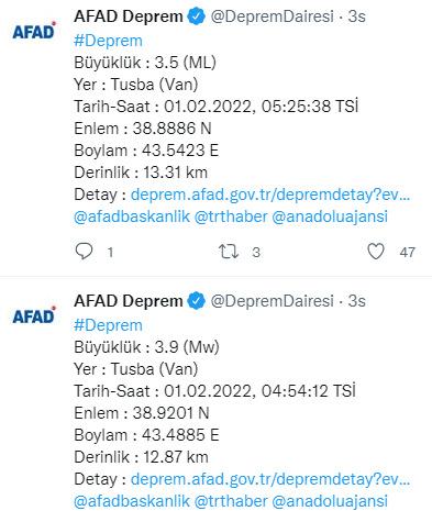 Afet ve Acil Durum Yönetimi Başkanlığı (AFAD) verilerine göre deprem Van Tuşba'da saat 04:54'te 3.9 ve 05.25'de 3.5 büyüklüğünde iki deprem meydana geldi.