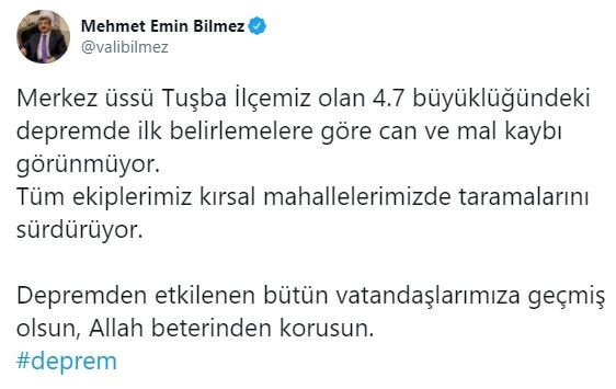 Van Valisi Mehmet Emin Bilmez, depremle ilgili Twitter hesabı üzerinden bir paylaşım yaparak vatandaşları bilgilendirdi. 4.7 şiddetinde meydana gelen depremdeki ilk belirlemeler doğrultusunda can veya mal kaybı gibi olumsuzlukların yaşanmadığını belirten Bilmez, bütün ekiplerin kırsal mahallelerdeki tarama çalışmalarına devam ettiği bilgisini verdi.