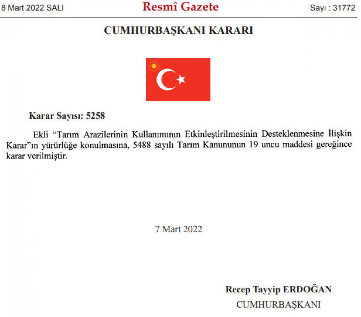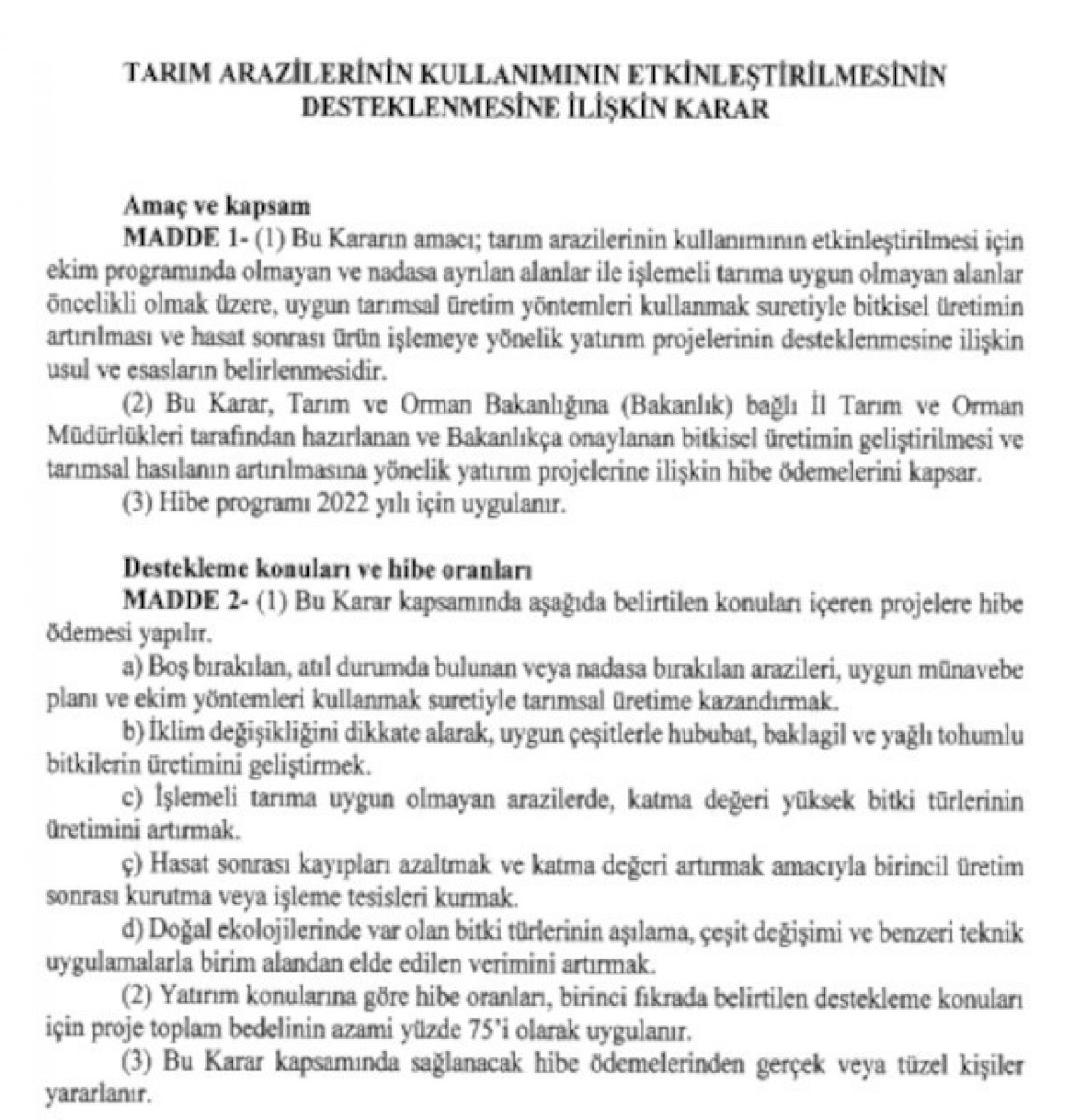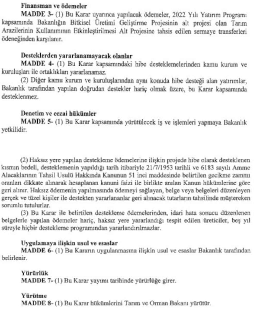 Cumhurbaşkanı kararıyla boş bırakılan, atıl durumda olan veya nadasa bırakılan arazilerde hububat, baklagil ve ayçiçeği, kanola, soya, aspir gibi yağlı tohumlu bitki üretimine hibe desteği verilecek.