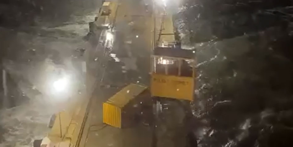Fırtınada bölgede oluşan hasarları inceleyen Tersane Müdürü Alper Akalın ve Başmühendis Özkan Kara, konteyner ve forklift arasında kaldı.