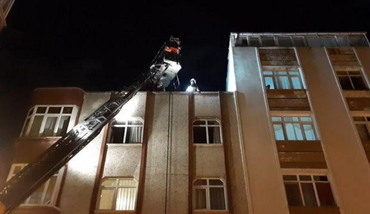 Yardıma koşan vatandaşlar sokakta battaniye açtı. Çatı katında mahsur kalan 3 kişi açılan battaniyenin üstüne atlarken ağır yaralandı.