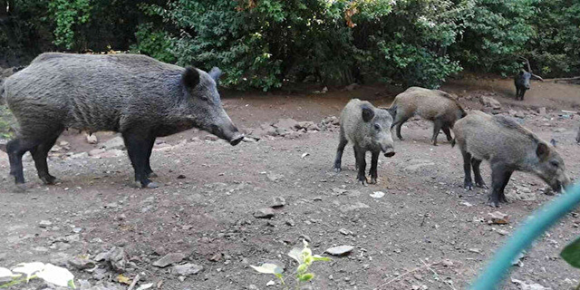 Otel bahçesine gelen domuzlar bir süre sonra bölgeden ayrıldı.