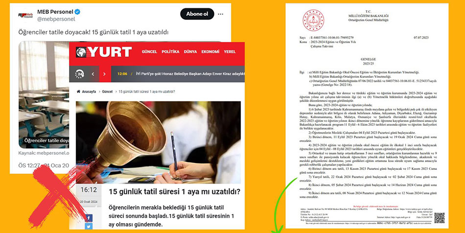 "Bazı sosyal medya hesaplarında paylaşılan, "15 günlük sömestr tatili 1 aya uzatıldı" iddiası doğru değildir. Milli Eğitim Bakanlığı’nın 7 Temmuz 2023 tarihinde yayımladığı çalışma takvimi konulu genelgeye göre, 2023-2024 eğitim öğretim döneminin yarıyıl tatili süresinde bir değişiklik bulunmamaktadır. Yarıyıl tatili, 22 Ocak 2024 tarihinde başlamış olup, 2 Şubat 2024 tarihinde sona erecektir" ifadelerine yer verdi.