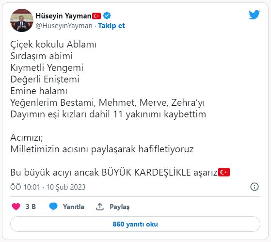 AK Parti Milletvekili Hüseyin Yayman Twitter'dan yaptığı açıklamada, "Çiçek kokulu ablamı, sırdaşım abimi, kıymetli yengemi, değerli eniştemi, Emine halamı, yeğenlerim Bestami, Mehmet, Merve, Zehra'yı, dayımın eşi kızları dahil 11 yakınımı kaybettim. Acımızı, milletimizin acısını paylaşarak hafifletiyoruz. Bu büyük acıyı ancak büyük kardeşlikle aşarız" ifadelerini kullandı.