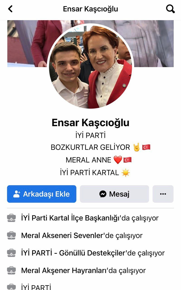 Akşener'in sözde Silivri'de karşılaştığı Ensar Kaşçıoğlu'nun İP Kartal İlçe Başkanlığı'nda görevli olduğu ortaya çıktı. Ensar Kaşçıoğlu'nun sosyal medya hesaplarının İP'in resmi hesabını aratmadığı görüldü.