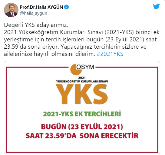 Ölçme Seçme ve Yerleştirme Merkezi (ÖSYM) Başkanı Prof. Dr. Halis Aygün, sosyal medya hesabından yaptığı paylaşımda, "Değerli YKS adaylarımız, 2021-YKS birinci ek yerleştirme için tercih işlemleri bugün saat 23.59'da sona eriyor. Yapacağınız tercihlerin sizlere ve ailelerinize hayırlı olmasını dilerim." ifadelerini kullandı.