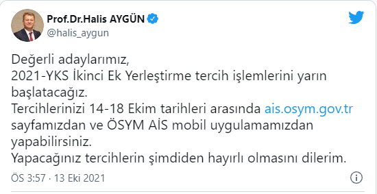 ÖSYM Başkanı Aygün, "Değerli adaylarımız, 2021-YKS İkinci Ek Yerleştirme tercih işlemlerini yarın başlatacağız. Tercihlerinizi 14-18 Ekim tarihleri arasında http://ais.osym.gov.tr sayfamızdan ve ÖSYM AİS mobil uygulamamızdan yapabilirsiniz. Yapacağınız tercihlerin şimdiden hayırlı olmasını dilerim." ifadelerini kullandı.