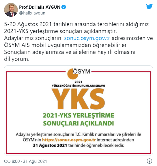 Aygün, Twitter'dan yaptığı paylaşımda, 5-20 Ağustos 2021 tarihleri arasında tercihleri alınan 2021-YKS'de yerleştirme sonuçlarının açıklandığını, sonuçların http://sonuc.osym.gov.tr adresinden ve ÖSYM AİS mobil uygulamasından öğrenilebileceğini bildirdi.