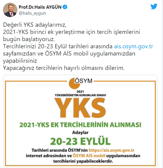 Aygün, sosyal medya hesabından, "Tercihlerinizi 20-23 Eylül tarihleri arasında http://ais.osym.gov.tr sayfamızdan ve ÖSYM AİS mobil uygulamamızdan yapabilirsiniz Yapacağınız tercihlerin hayırlı olmasını dilerim." paylaşımında bulundu.