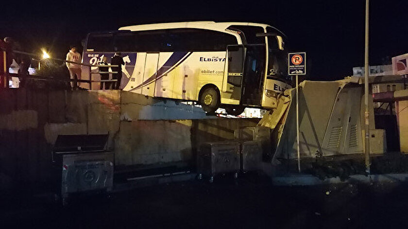 Mintan Deresi üzerindeki köprünün demir bariyerini kıran otobüs, elektrik trafosuna çarparak köprü ile trafo arasında asılı kaldı.