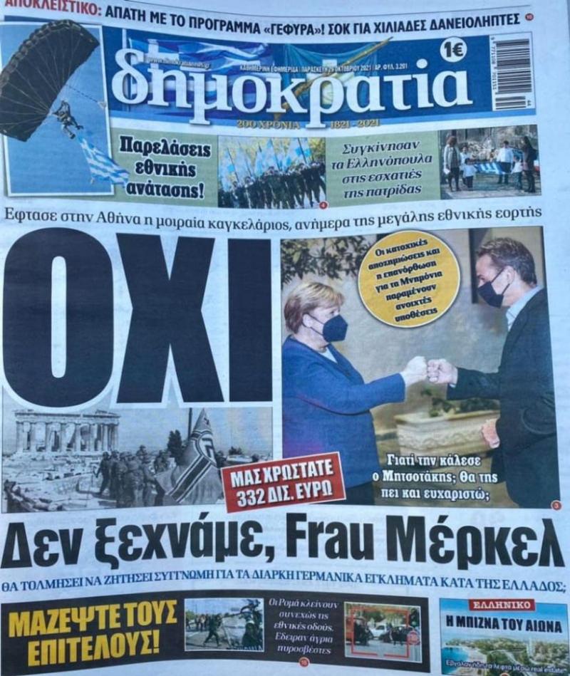 Yunan gazeteleri, Almanya Başbakanı Angela Merkel'in Yunanistan'a gerçekleştirdiği iki günlük ziyaretinde Yunanistan ile Almanya arasında 2. Dünya Savaşından tazminat taleplerini manşetlerine taşıdı. “Dimokratia” gazetesi manşetinde, "Hayır! Unutmadık Merkel. Bize 322 milyar borçlusunuz!" ifadelerini kullandı. Gazete, haberde Yunanistan Başbakanı Kyriakos Miçotakis'in onuruna yemek verdiği Merkel'i karşıladığı an çekilen fotoğrafı kullanırken, yanına da gamalı haç fotoğrafı yerleştirdi.