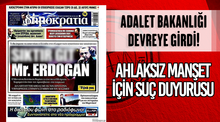 Adalet Bakanı Gül, Dimokratia gazetesinin Erdoğan'a alenen küfür ettiği manşetten ötürü meslektaşı, Yunanistan Adalet Bakanı Tsiaras'a mektup gönderdi.