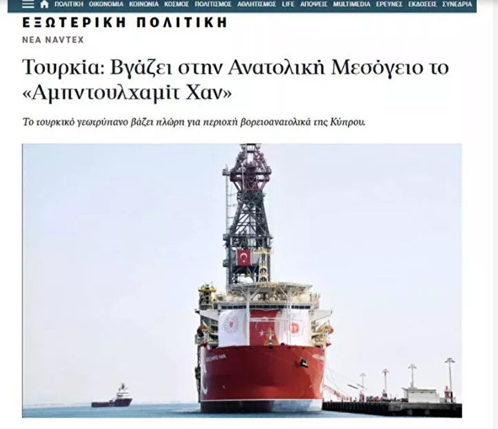 Ethnos gazetesi ise, 'Ankara Abdülhamid Han'ı Doğu Akdeniz'e indiriyor' başlığını kullandı, Türkiye'nin araştırma gemisini Kıbrıs'ın kuzeydoğusuna göndermekle 'provokasyon'a giriştiğini ileri sürdü.
