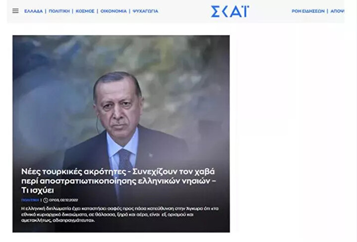 Skai televizyonunun internet sitesinin manşeti, 'Yeni Türk aşırı uçları-Yunan adalarının silahsızlandırılmasını konuşmaya devam ediyorlar' oldu. Televizyon, MGK kararlarını ise 'Türkler Ege Denizi adalarının derhal silahsızlandırılması çağrısını yapıyor' başlığıyla sundu.