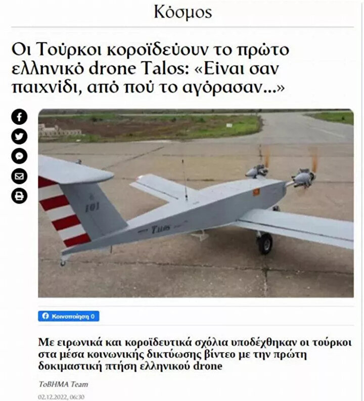 İlk sayfasında 'Türkler ilk Yunan drone'u Talos'la alay ediyor: Oyuncak gibi, nereden almışlar' başlığını atan To Vima gazetesi ise, test uçuşu videosu yayımlanan ilk Yunan insansız hava aracının Türkiye'de ironik ve alaycı yorumlarla karşılandığını bildiriyor. Habere göre, Türk basını Talos adı verilen insansız hava aracının test uçuşunu 'Daha çok bir oyuncağa benziyor' yorumuyla yayımladı.