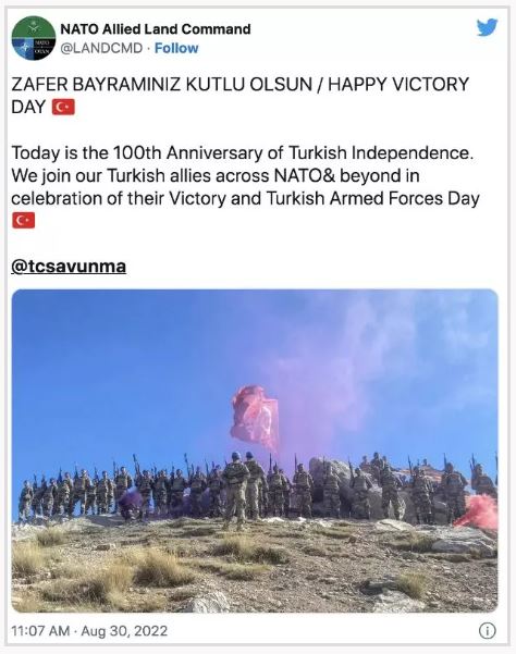 Paylaşımda Türkçe olarak "Zafer Bayramınız kutlu olsun. Bugün Türk bağımsızlığının 100. yıl dönümü. Zafer ve Türk Silahlı Kuvvetleri Günü kutlamalarında NATO ve ötesindeki Türk müttefiklerimizin yanındayız" ifadeleri yer aldı.