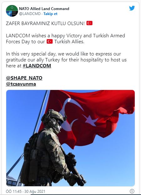 NATO Müttefik Kara Komutanlığı, 30 Ağustos Zafer Bayramı gerekçesiyle sosyal medya hesabından Türkiye'yi kutladığı bir mesaj paylaştı.