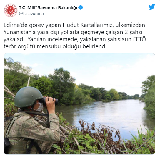 Milli Savunma Bakanlığı (MSB), "Edirne'de görev yapan Hudut Kartallarımız, ülkemizden Yunanistan'a yasa dışı yollarla geçmeye çalışan 2 şahsı yakaladı. Yapılan incelemede, yakalanan şahısların FETÖ terör örgütü mensubu olduğu belirlendi." açıklamasında bulundu.