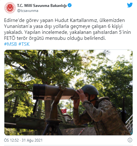 "Edirne'de görev yapan Hudut Kartallarımız, ülkemizden Yunanistan’a yasa dışı yollarla geçmeye çalışan 6 kişiyi yakaladı. Yapılan incelemede, yakalanan şahıslardan 5’inin FETÖ terör örgütü mensubu olduğu belirlendi."