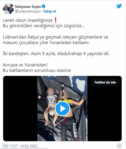 İçişleri Bakanı Süleyman Soylu, Lübnan’dan İtalya’ya geçmek isteyen düzensiz göçmen grubuna Yunanistan’ın müdahalesi sonucunda hayatını kaybeden Asım (9 aylık) ve Abdulvahap (4) adlı iki kardeşin cansız bedenlerinin denizden çıkarılmasına ait görüntüleri sosyal medya hesabında paylaştı.