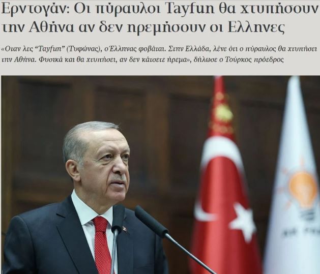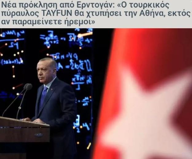 Ethnos, verilen mesajı, "Erdoğan'dan yeni meydan okuma: Siz sakin kalmazsanız Türk füzesi Tayfun Atina'yı vuracak" şeklinde gördü.
