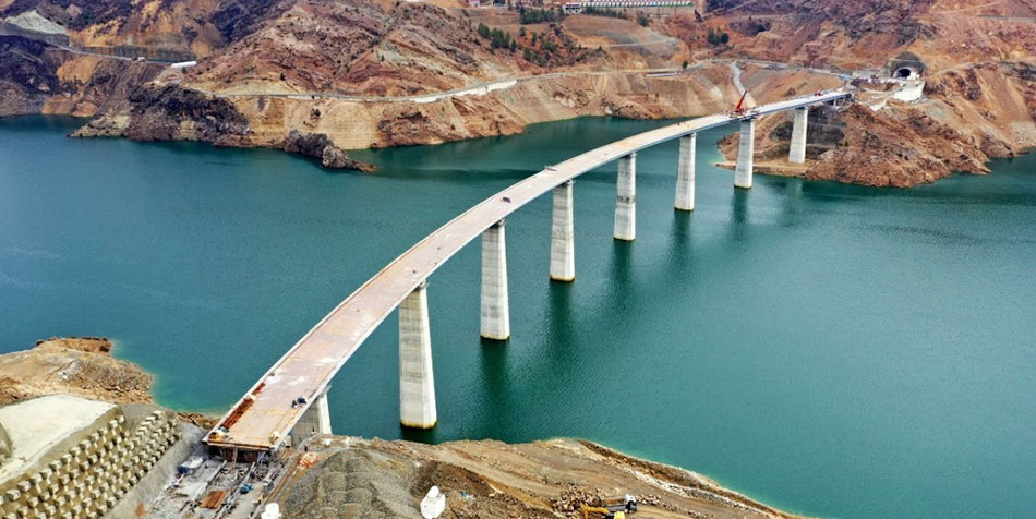 Yusufeli ilçesinde yeni ilçe merkezine ulaşımda önemli rol oynayacak olan merkez viyadüğünün de oldukça önemli olduğunu belirten Bakan Uraloğlu, “Yeni ilçe merkezini mevcut kara yoluna bağlayacak olan baraj gölü üzerinde 150 metre yüksekliğinde 685 metre uzunluğunda, dengeli konsol ve dökme sistemi kullanılarak inşa edilen viyadük için çalışmalarımız hızla sürüyordu. Çalışmalarda artık sona geldik.” İfadelerini kullandı.