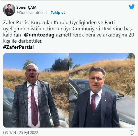 "Zafer Partisi Kurucular Kurulu Üyeliğinden ve Parti üyeliğinden istifa ettim. Türkiye Cumhuriyeti Devletine baş kaldıran Ümit Özdağ, azmettirerek beni ve arkadaşımı 20 kişi ile darbettiler."