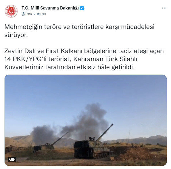 Milli Savunma Bakanlığından yapılan açıklamaya göre, Zeytin Dalı ve Fırat Kalkanı bölgelerine taciz ateşi açan 14 PKK/YPG'li terörist, Türk Silahlı Kuvvetleri tarafından etkisiz hale getirildi.